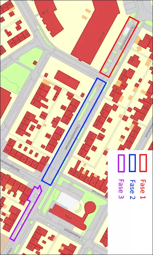 Op de achterkant van de brief staat een kaart van het werkgebied en hoe de fases zijn opgedeeld.