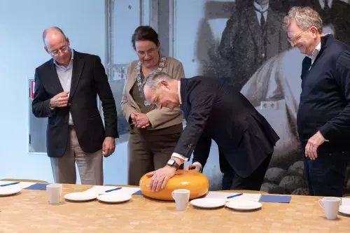 Afbeelding: Commissaris van de Koning in Noord-Holland, Arthur van Dijk snijdt de kaas aan bij het bezoek aan CONO Kaasmakers.