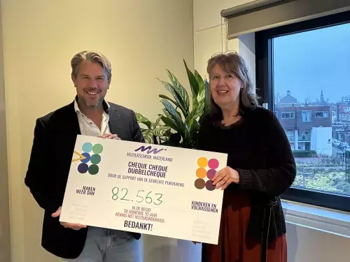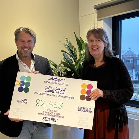 Op de foto is te zien hoe Esther Dam een symbolische cheque overhandigt aan wethouder Verkroost. Op de cheque staat vermeld: ‘Door de support van de gemeente Purmerend maken meer dan 82.563 kinderen en volwassenen in de regio de komende tien jaar kennis met muziekonderwijs.’