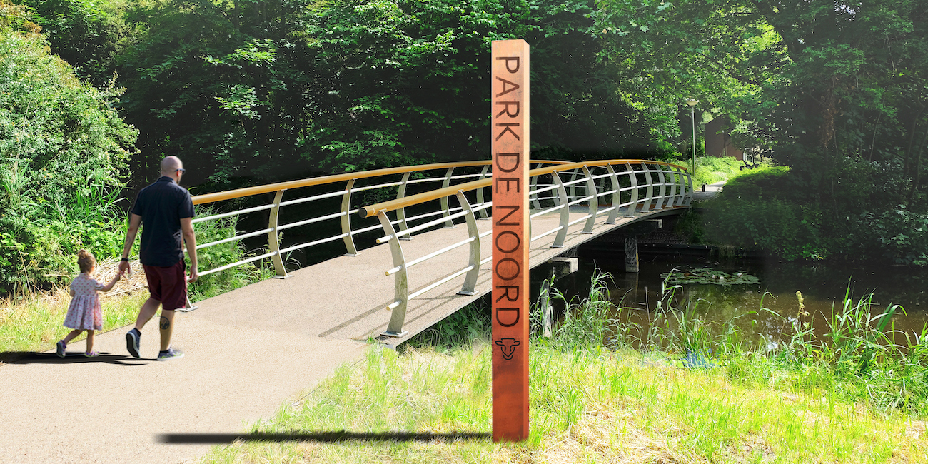 Alle bruggen in de Park De Noord zien er straks hetzelfde uit. Ze liggen vaak direct bij de ingang en zijn daarom belangrijk voor de sfeer van het park. Er komen 2 nieuwe bruggen in het park die onderdeel zijn van het doorgaande fietspad. 1 brug wordt vervangen en de andere brug verplaatst om opnieuw te gebruiken in de waterverbinding naast het Kwadijkerpark. De al aanwezige bruggen blijven liggen en krijgen dezelfde stijl als de nieuwe bruggen. Een duurzame oplossing.