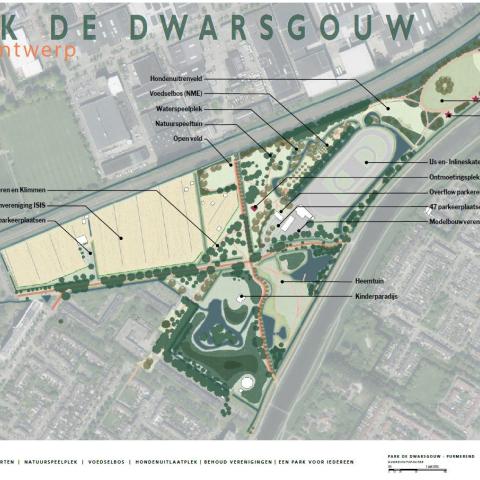 Het schetsontwerp voor Park De Dwarsgouw is klaar. Dankzij ideeën van bewoners en verenigingen in het gebied. Dit ontwerp werken we verder uit, samen met toekomstige gebruikers van de speeltuin, het hondenuitrenveld en de sportplekken.